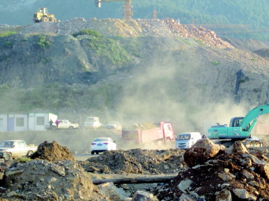 随后,数辆卡车运土进山,所经之处随即暴起飞尘,一直到山坡顶端。未被硬化的进山路面一段,覆盖着较厚的积尘,行人踩过之后,脚印清晰可见。
