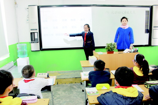举手的学生中,张晴同学第一个走上讲台。“小老师”带领全班同学拼读大屏幕上打出的十几组本节课的新词,之后提问读词、齐读,“小老师”下台。“大老师”许双霞登台点拨提升:“请同学们再说出一个或几个像‘破烂不堪’一样含有‘不堪’的词语。”同学们积极举手回答。