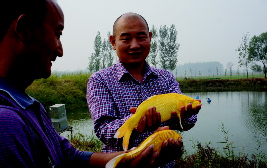 日前,在滨州经济技术开发区里则办事处堤口赵村,滨州华美观赏鱼基地,负责人吴刚与基地工人正在比较中华锦鲤的成色,选出最好的参加在高密组织的山东省观赏鱼选美大赛。吴刚表示,因为堤口赵村紧邻小开河,交通便利,黄河水非常方便,是搞养殖业的宝地。
