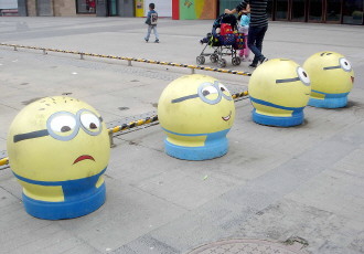 时间:2015年10月20日 自述:一排萌萌的小黄人蹲在那里干啥呢?原来是石墩上画上的画啊。 点评:一个个都那么尽责,管理员记得每天定时喂香蕉哦。