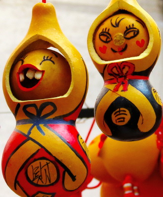 时间:2015年7月28日 自述:成熟的葫芦被做成了胡侃八侃的大嘴形象,挺传神的。 点评:竟然连那几颗大牙都是葫芦籽做的,真是一点没浪费材料。
