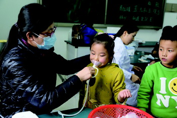 4日,德城区防疫站医生来到北园小学,对全校学生进行一年一度的健康体检,包括眼科、口腔、内科等项目。