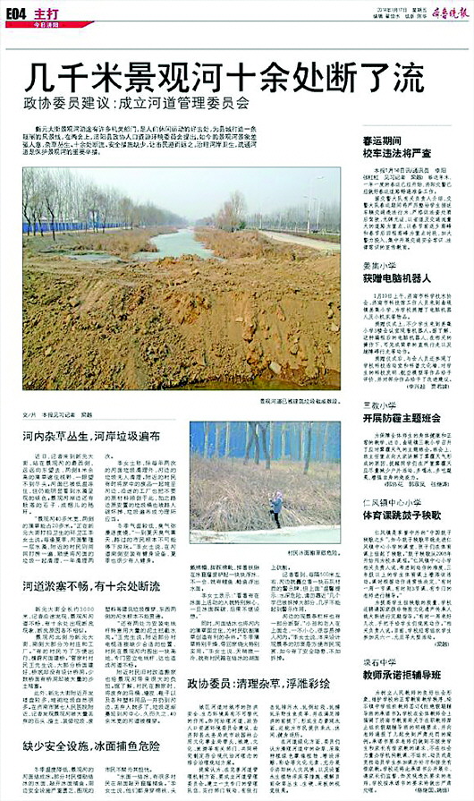 继本报2014年1月17日刊登以《几千米景观河十余处断了流》为题的稿件后,景观河相关设施何时能复修成为不少市民一直关心的事件。今年上半年,济阳县市政园林公用事业局对观景亭进行复修,更换86根桥墩。