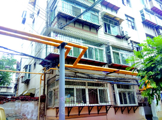 今夏,玉函小区北区内还有部分楼房没有进行节能改造,但黄色的供暖管道已安装完成。(资料片)