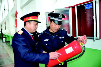 11月19日是消防日,济南铁路公安处巨野站派出所对巨野火车站职工开展了消防宣传教育,并对候车室、货场等重点防火部位开展了消防检查。图为巨野站派出所民警,在对巨野站候车室的的消防器材和货场的消防设施、灭火设备性能进行检查。