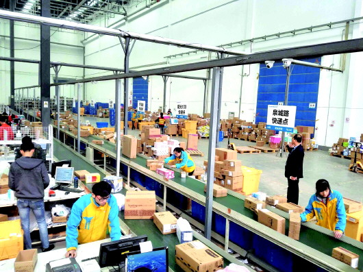 11日,济南苏宁物流中心的工人忙碌地分拣包裹。 本报记者 任磊磊 摄