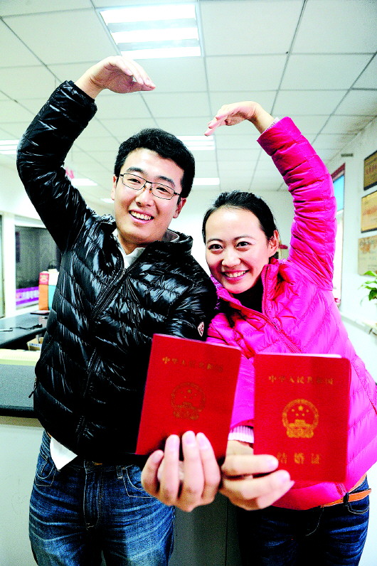 “我们特意挑的这一天,光棍节正式摆脱光棍一族。”谈了两年恋爱的李华一边举着“红本本”与爱人拍照留念,一边兴高采烈地说。