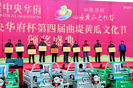 黄瓜文化节除有精彩的节目表演,还有激动人心的颁奖仪式。活动现场主持人相继公布了获得文明诚信客户奖、品牌维护贡献奖、服务市场先进单位、营销惠农贡献奖、种植状元等七类奖项,并颁发两轮电动车、电动三轮车等奖品。