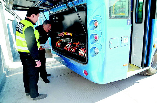 济南市车辆管理所查验科张敦华副科长带着一名助理查验员在交警大队车管所民警配合下,到商河公共交通客运中心实行上门查验服务,将28辆新能源大型电动客车一次性查验完毕挂上新牌。