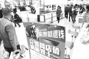 手提刚买的微波炉,市民孟涛跟妻子正挑选空调。为购置新房家电,孟涛足足等了一个多月,只待“双11”这天。为此,孟涛也没少逛了商场、上网比价。“一直再考虑,是在网上买,还是在实体店买。”本打算先到商场看看的孟涛,“全网比价,差价返还”,席卷全场的促销价,让他动了心。