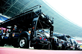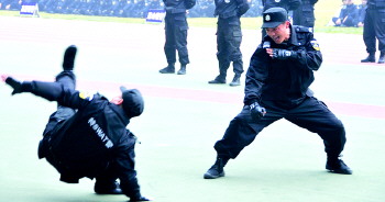 上午9点,济宁体育中心主体育场上。“展演开始!”指挥官一声令下,展演也拉开了序幕。汶上特巡警大队40余名队员首先登场。伴随着响亮的口号,他们展示了面对突发情况,如何进行有效控制和处理。在动感十足的音乐声中,高新区特巡警大队的队员们跳起了搏击操。将擒敌和搏击技术有效融入搏击操中,不仅起到了放松身心的效果,也提高了特警队员的专业技能。随后登场的梁山特巡警队员们以扎实的武术功底,演绎出的格斗场景让人印象深刻.