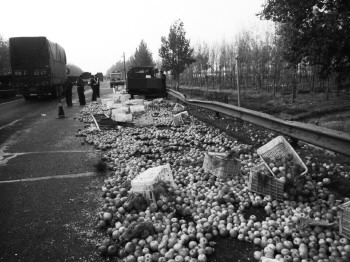 车上满载的3吨苹果撒在高速公路上