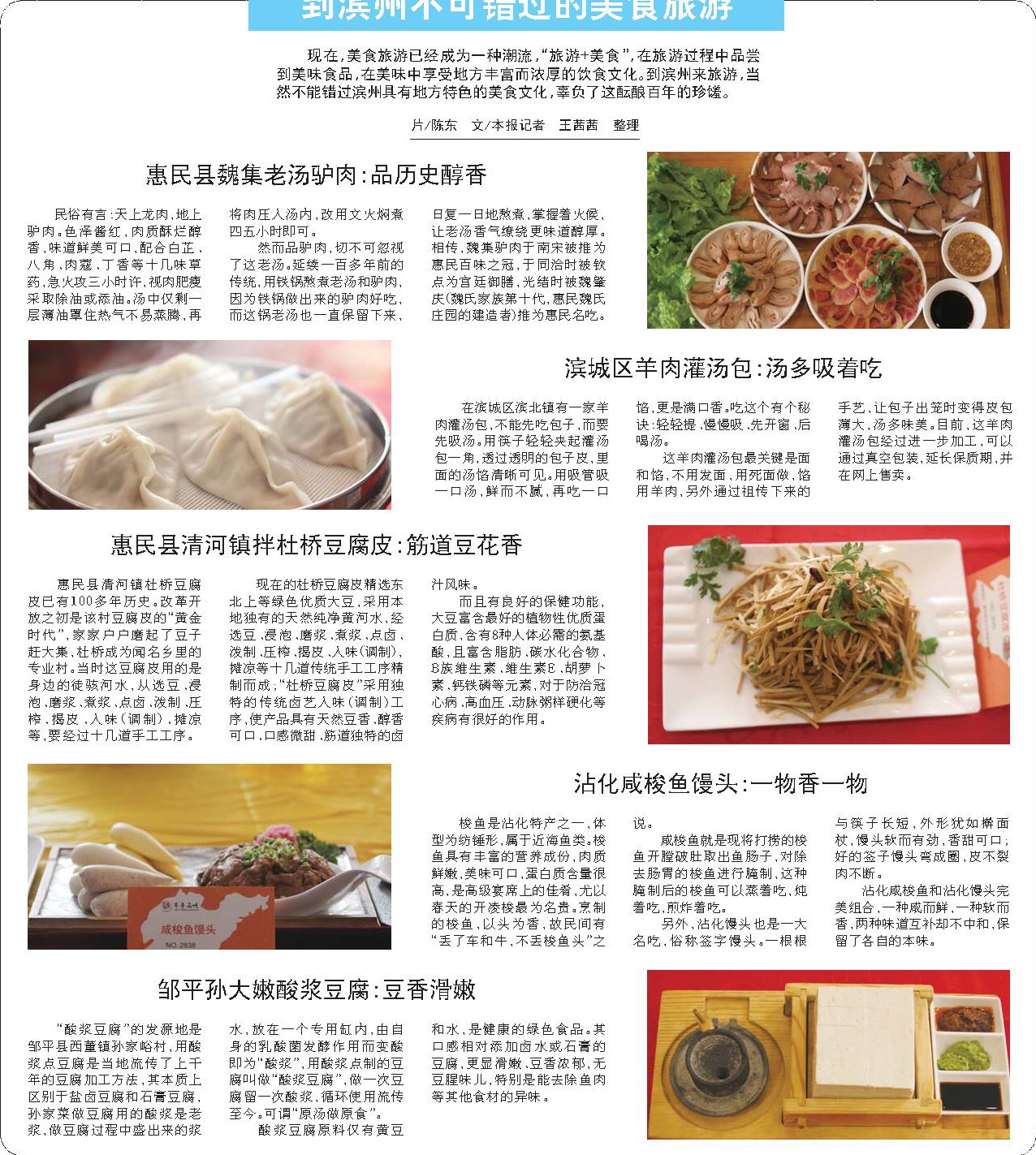 现在,美食旅游已经成为一种潮流,“旅游+美食”,在旅游过程中品尝到美味食品,在美味中享受地方丰富而浓厚的饮食文化。到滨州来旅游,当然不能错过滨州具有地方特色的美食文化,辜负了这酝酿百年的珍馐。