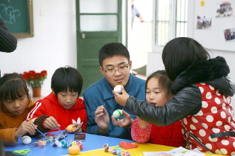 9日,在枣庄供电公司滕州客服中心捐建的鲁能滕州希望小学留守儿童快乐成长活动站内,该中心10余名爱心志愿者给孩子们送去书橱、桌椅,书法、绘画、手工制作等物品,以及电子琴、葫芦丝等乐器,并与他们一起互动学习,培养孩子们多种兴趣爱好。图中爱心志愿者正和孩子们一起做手工。 本报记者 张冬梅 摄影报道