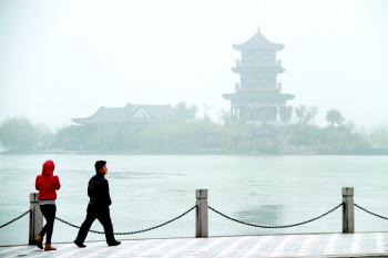 连日来,聊城持续雾霾天气,空气质量下降。11日,聊城市发布重污染天气蓝色预警,启动Ⅳ级响应措施。市气象台随后发布霾黄色预警信号,预计11日夜间到12日白天,中度以上的霾天气仍将持续。图为东昌湖边,远处的景物被雾霾所笼罩。 本报记者 李军 摄