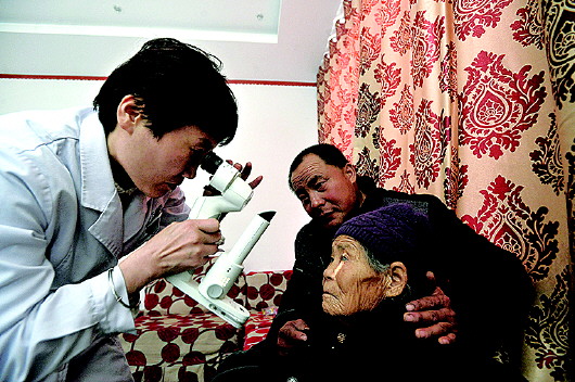 12日,济南历下区人民医院眼科专家郭建莲特意赶往费县,为裴明荣老人检查眼睛。