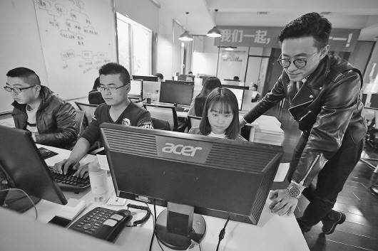 ◥张帅(右)和他的年轻团队。本报记者 张晓鹏 摄