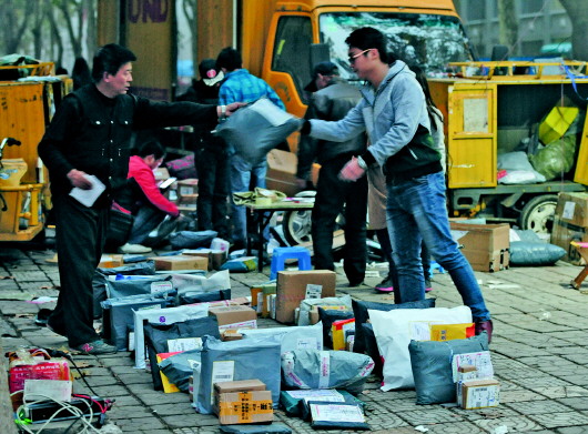 12日,在山师大校园内,学生们在领取“双11”购物节前夕和当日抢购的商品快递。据了解,济南本地和山东其它地市的快递单子已经开始抵达目的地,而大规模的高潮将在明后日见到。 本报记者 周青先 摄