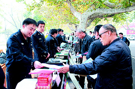 在活动现场,民警还利用现成的事例,以案说法,开展了“法治六进”(进机关、进企业、进学校、进社区、进乡村、进单位)宣传活动(右图)。于云辉表示,在公安系统做好犯罪行为发生后的破案打击和挽损工作的同时,希望广大市民能够切实增强自我防范意识,克服麻痹大意心理,堵住犯罪的源头。