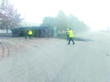 车祸现场,大货车侧翻在路边。