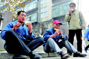 忙的时候,维修工只能在路边吃个烧饼充饥。