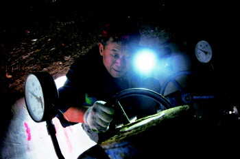 ◤维修工赵学良到井下开阀门,对井下黑暗、潮湿的环境早已习以为常。