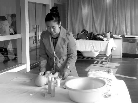 在母婴护理比赛现场,完成其他操作后的选手,正在等待最后的实作考试。与60后、70后的母婴护理师参赛者相比,一名看上去还很像学生的选手赵咪显得很稚气。