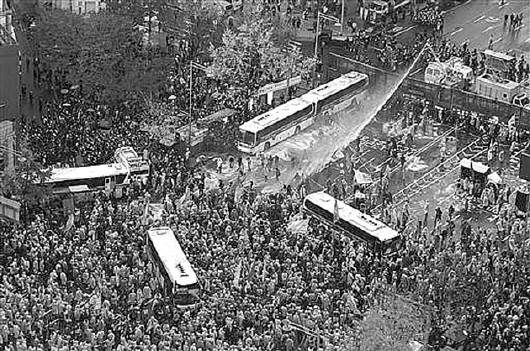 14日,在首尔光化门广场,警方在用高压水炮驱散示威人群。