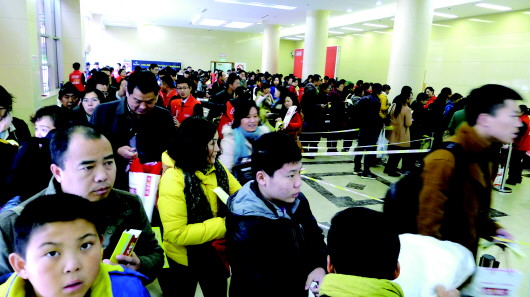 14日,历山路,为了抢到一家社会辅导机构的中小学生打折收费课程,数以千计的家长一大早就冒着寒风排队入场。尽管双休日学校停课,但社会上的辅导班越来越火,中小学生能轻松度周末的不多。