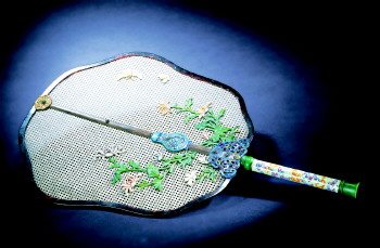 近年最受关注、价值最高的宫扇,当属2009年现身保利拍卖的“清乾隆象牙丝编织菊蝶图画珐琅柄宫扇”了,此柄宫扇精巧别致,扇面由厚度不到1毫米的象牙丝编织成的仿蒲草纹镂空锦地组成。在玲珑剔透的扇面上再以细铜丝绑附、用茜色象牙雕刻的菊花蝴蝶图案进行装饰,团扇边缘以巨大的整张玳瑁挖镶成一个连续不断的外框;扇面中心以棕竹为柄梁,柄梁嵌烧蓝装饰,镶嵌有铜镀金点翠錾蝙蝠纹护顶,下承绿色染牙和浅绿地铜胎画珐琅螭龙云纹扇柄。一柄小小的宫扇之上汇集了如此众多的工艺门类,且用料之奢侈、工艺难度之匪夷所思着实令人惊叹,被专家推断为清代雍正到乾隆早期广州大师级牙匠贡御的极品。
