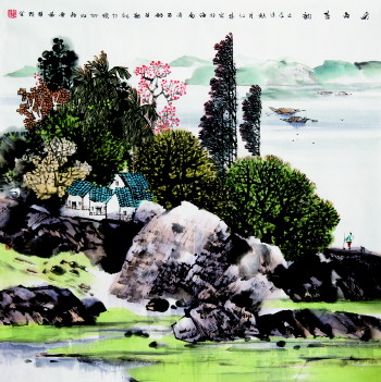 书画艺术,总之是要在真实的世界之外给观者构造一个完美自足的空间,使画者和观者的精神得以栖息。南画一词,董玄宰已言尽其妙,数百年来南画占据画坛之重席。今天的阮先生实现了在吸收前人之所长的基础上将南画推向深入、推向具体的一个大胆跨越,再进一步地讲,他已是南画脉络中“海南画风”的领军人物,2012年8月,“海南当代国画优秀作品展”中他的国画山水在北京全国政协礼堂展出。阮先生的作品以椰风海韵、黎村苗寨、南上渔民等极具代表性的海南元素和民俗风情为表现内容,以格调豪迈、气势恢宏、笔墨酣畅、色彩斑斓的笔触热情讴歌和赞美海南,这是他积极投身创作,在社会生活中汲取素材、提炼主题,以生动的笔触、感人的形象开展创作的成果。原中共中央政治局常委、全国政协主席贾庆林观展后对其艺术上取得的成就给予了高度评价,希望其用手中的笔、心中的感情,画更广阔的大海、更美好的自然、更质朴的人文,进一步弘扬中华文化的优良传统,扩大海南当代国画在全国的影响,为发扬和发展传统国画艺术作出更大贡献。我也衷心地祝愿阮君在未来的丹青生涯中能继续“笼天地于形内,挫万物于笔端。”