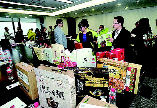 11月4日下午两点,来自全省各地的供货商将举行选货会的会议室坐得满满当当,他们带来的各类特色产品样品摆满了会议室的展示区。其中有黄河口大闸蟹、沾化冬枣、沂源红苹果、栖霞苹果、东平湖鸭蛋等山东知名特产,还有独具特色的红枣酒、以桃花入茶的泰山茶、原生态的巢蜜等。到场参加的供货商达50多家,特产品类60余种。