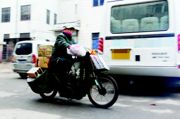 装完车之后,满载快件的张伟骑着自己的车子驶出邮局的大门。