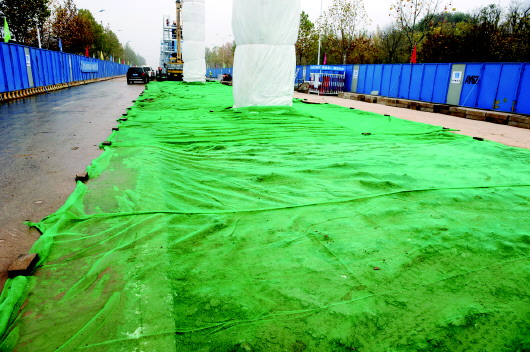 17日,济南西郊地铁R1线施工现场,工地用防尘网遮盖土地防止扬尘。