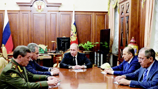 ◤17日,俄罗斯总统普京(中)召开会议讨论在埃及西奈半岛坠毁的俄空客A321型客机的调查情况。
