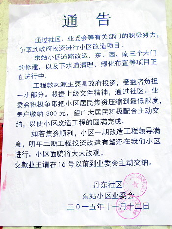 在小区大门北侧门岗外,记者看到一则致小区居民的通告,通告称,“东站小区道路改造,东、西、南三个大门的修建,以及下水道清理、绿化布置等项目正在进行中。工程款来源主要是政府投资,受益者负担一小部分。根据上级文件精神,通过社区、业委会积极争取把小区居民集资压缩到最低限度,每户缴纳300元。”