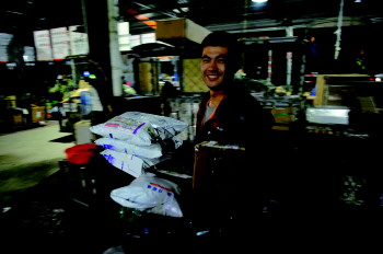 快递员张守成负责大连路附近的派件工作,派送完一天的快件,每天下午6点左右,天已经全黑,他还需要将收揽的快件,送到分拨中心,这时分拨中心已经灯火通明,本来身体并不壮硕的他,将快件从车上卸下,巨大的邮件包裹,显得他身材更加瘦小。