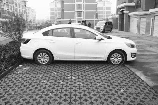 ▲一辆白色轿车的轮胎被扎。