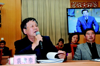 人大代表袁聿泰向市教育局局长赵新法进行询问。 本报记者 王鸿哲 摄