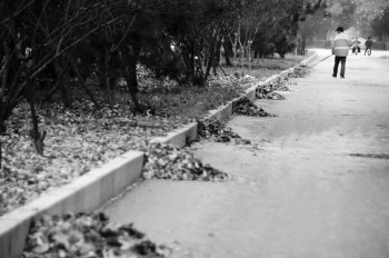 连续多日的降雨让树叶集中飘落,在绿化率比较高的经济技术开发区天衢东路上,环卫工人每隔两三米就能扫起厚厚的一堆落叶。 本报记者 马志勇 摄