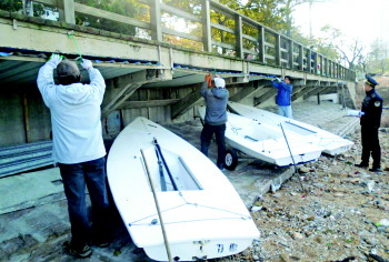 18日,在汇泉路上,市南城管查处一起违法占用木栈道堤坝行为,现场拆除违建60平方米。据了解,该处木栈道堤坝下方空间被人私自占用,以木板间隔建成储藏室存放帆船部件,影响了海滩环境,也给木栈道带来安全隐患。