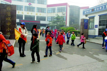 张店城中小学门口,来自理工大学的志愿者引导学生有秩序的放学(资料片)。