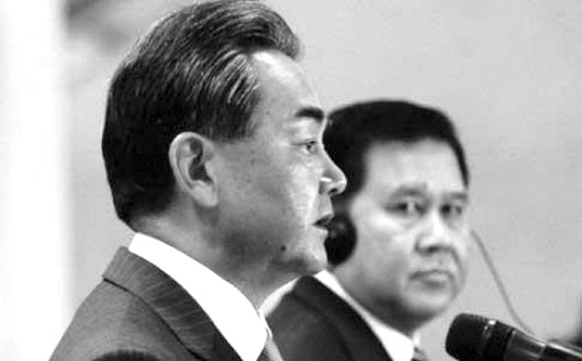 8月4日,泰国外长塔纳萨(右)在东盟外长会议上看着中国外交部长王毅。 (资料片)