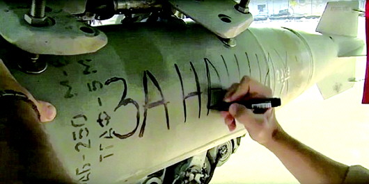 俄空军发动空袭之前,在炸弹上写“为了巴黎”,声援恐袭受害者。 据美联社