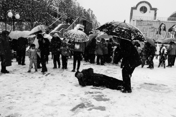 11月24日,市区中心广场上,大理石地面变得异常湿滑,不时有市民滑倒。 本报记者 马志勇 摄