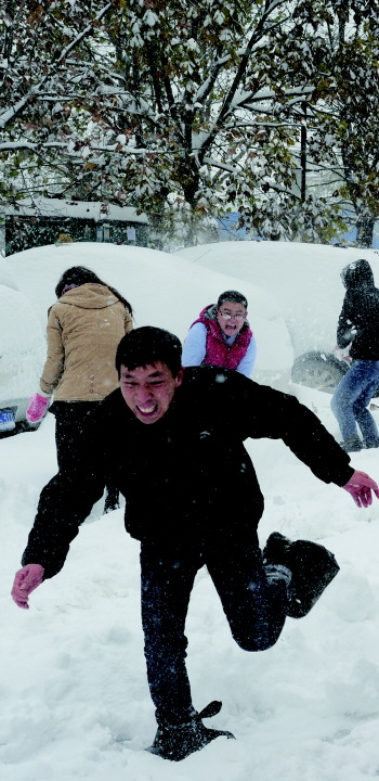 初雪中街头嬉闹的年轻人。 本报记者 景佳 摄