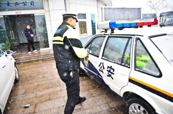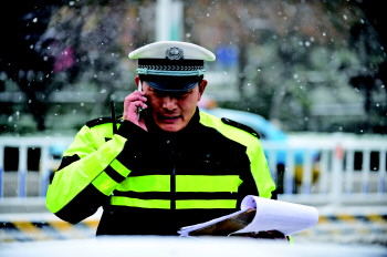 刘加凯是日照交警直属大队的一名协勤,因为全员上阵,刘加凯一大早到岗后就没闲下来,事故信息一个接着一个地从他的对讲机中传出,单单一早上的上下班高峰时段,他到达现场的事故就有8个,他每到一个现场,都会按照规程向当事司机了解事故详情并记录,然后再将记录交给具体处理事故的交警处理。今天处理的事故大多是一些追尾碰撞之类的小事故,主要原因还是因为雨雪天气,路滑导致。