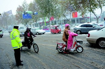 23日夜间起到记者24日傍晚发稿时,莒县辖区内下起了鹅毛般的大雪,由于气温低,积雪溶化后造成路面湿滑,给群众出行带来了严重不便。24日上午7时许,降雪渐大,道路能见度降低,车辆行驶速度缓慢,为确保道路安全畅通,交警莒县大队启动恶劣天气应急预案,积极部署警力,加大了路面管理力度,冷静沉着应对降雪恶劣天气,全员上路保畅通,稳妥扎实地做好各项交通管理工作。特别是一线值勤民警,顶风冒雪,坚守岗位,一丝不苟,全力引导车辆减速慢行,有效避免了交通事故的发生。