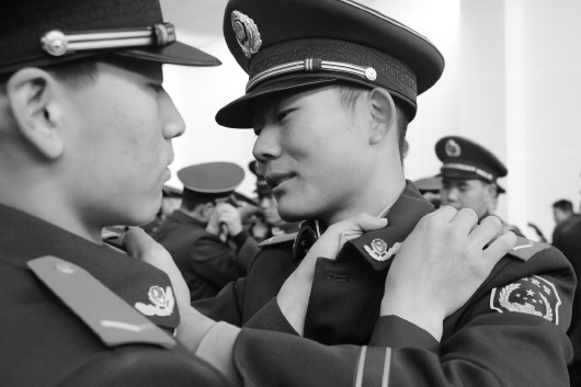 24日上午,武警滨州支队举行2015年度新兵授衔仪式。来自山东、山西、安徽等地的百余名新兵戴上了崭新的列兵警衔,正式成为合格的武警战士,融入“绿色方阵”。