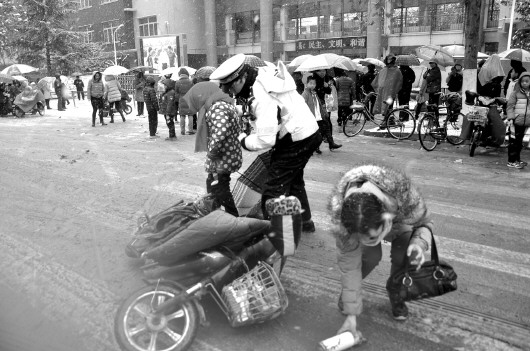 24日晚9点左右,我写完了稿子回宿舍,电动车不敢骑,只好步行。经过青年路和湖滨北路路口时,脚下一滑,摔倒在马路牙子下面,本能地想要站起来,又一个趔趄,哎呀妈啊,整个身子滑到了雪地里,身体一阵发麻,头有些发晕。我继续挣扎着,试图站起来,试了几次没成,干脆一下趴到雪地上,冰凉冰凉的感觉顿时袭来,上衣和裤子很快就湿透了。